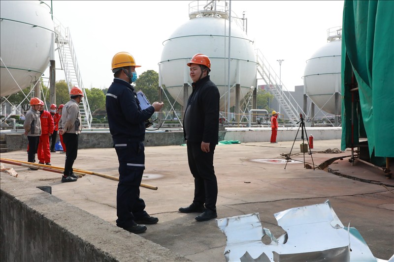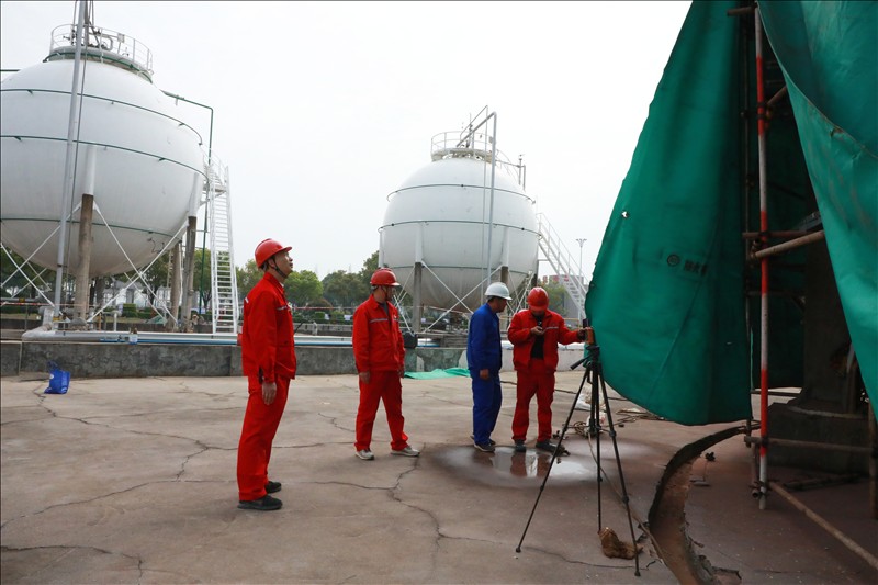 3月初,湖北省特检院直属分院得知金澳科技6台球罐需腾空物料、置换进行定期检验后,为减少对企业生产物料存储和连续性生产造成影响,立即成立以曾一彪检验师为组长的项目部,主动热情为企业提供服务,并到检验现场商讨腾罐计划,决定采取逐台倒罐、检验师连续加班检验等方式满足企业生产所需,公司总裁助理郑经友、设备机动处处长郑玉兵配合检定。